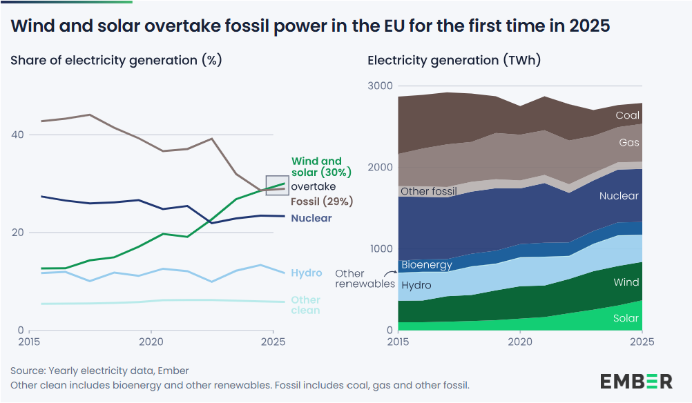 Emberの年次レビュー(European Electricity Review 2026)に関する報道では、2025年のEU電力で風力・太陽光の合計が30.1%に達し、化石燃料(29%)を初めて上回ったと示されています。太陽光は369TWhまで伸び、石炭火力は1割未満という過去最低水準になりました。一方で、水力の減少などがガス火力の増加につながり、需給のひっ迫局面では価格スパイクも起きています。電源の脱炭素化は前進しつつ、系統安定化と価格ボラティリティ対応が次の課題になっています。
