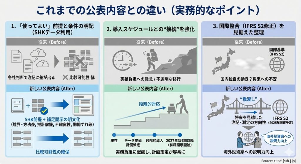 今回のポイントは「SHKの対外報告値をSSBJの開示体系に適合させるための要件が言語化された」ことです。